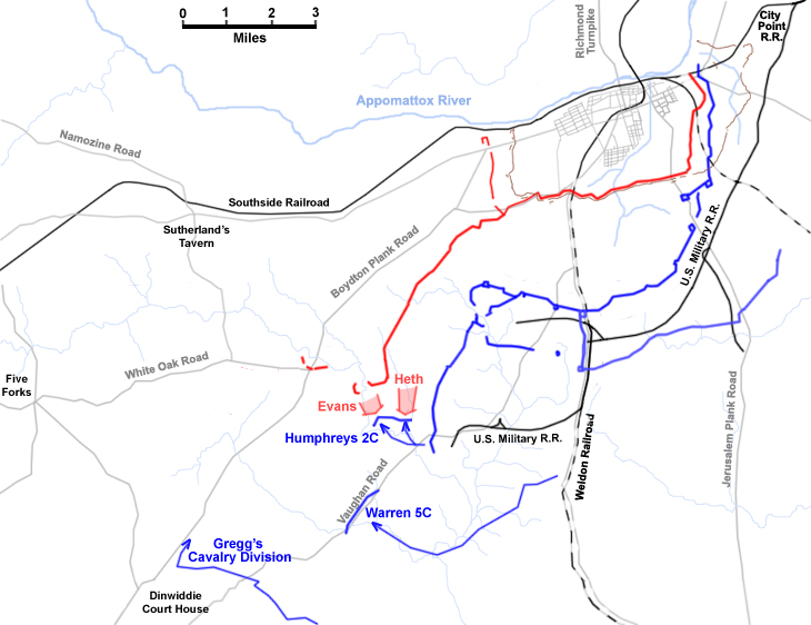 On the 29th March the 1st Division II Corps supported the V Corps and the army’s cavalry, under the leadership of General Philip Sheridan as they attacked the Rebels lines of communication for the last time.  On the 2nd April the Federal army broke through the Rebel lines, and the Confederate forces abandoned Petersburg the following day.  The II Corps joined the pursuit of the Rebel forces under the new command of Major General Andrew A Humphrys.  The Irish Brigade constantly skirmished with the rear guard of the Army Of Northern Virginia.