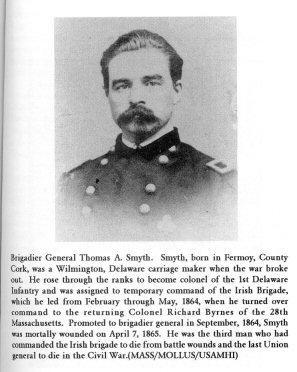 Irish Brigade regimental commanding officers 1865 – Major S F Gould 4th NYHA, Col DF Burke 88th NYSV, Brev Brig Gen R Nugent, Lt Col JJ Smith 69th NYSV, Lt Col J Flemming 28th MA, Major WH Terwilliger 63rdNYSV.