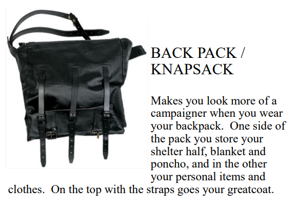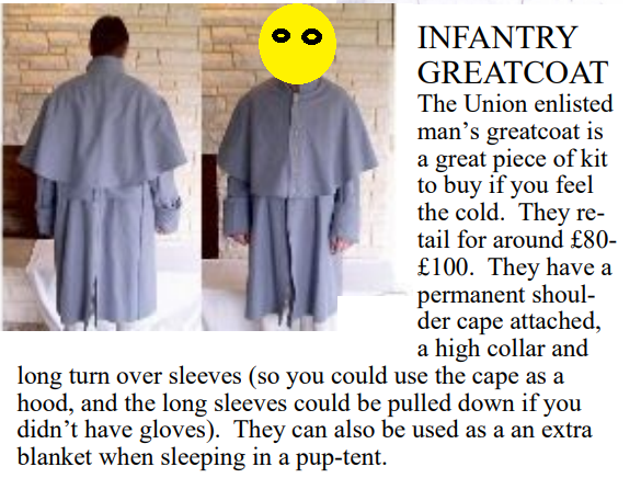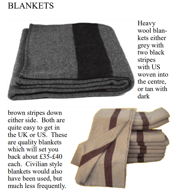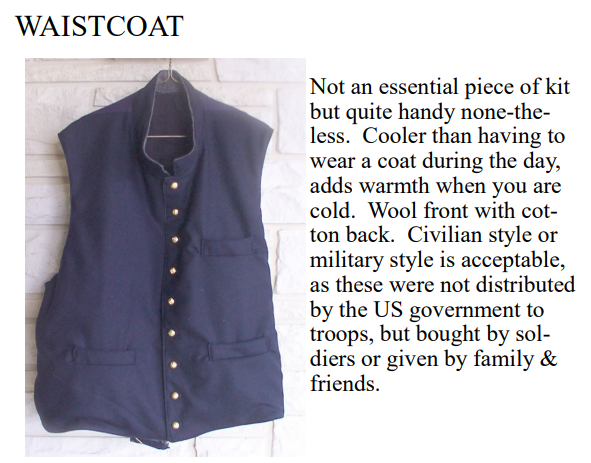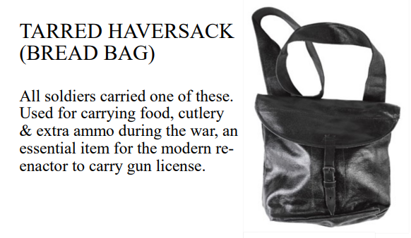 Living in the past means keeping all modern conveniences out of sight, eating from period plates, wearing woollen uniforms, or period civilian clothing, sleeping in “A Frame” or “Shelter” tents. Clothing and equipment is quite readily available from “Sutlers” in the United Kingdom, or from America for reasonable prices. Some members even make their own clothes to correct period patterns, using correct cloth.